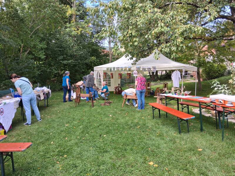 Kinder konnten Ausmalbilder gestalten, Flachs in Fühlboxen entdecken, „Kelten flechten“ lernen oder selbst Samen pulen. Auch das Spinnrad durfte ausprobiert werden – eine Erfahrung, die einige Besucherinnen und Besucher mit Begeisterung nutzten. Besonders schön war das Feedback einer Mutter, die meinte: „Toll, alle drei Kinder sind beschäftigt, das hatte ich so noch nie“